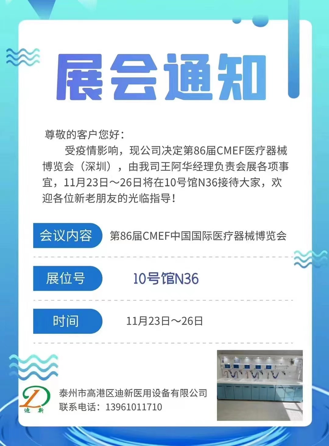 查看詳情尊敬的客戶您好: 受疫情影響,現(xiàn)公司決定第86屆CMEF醫(yī)療器械博覽會(深圳),由我司王阿華經(jīng)理負(fù)責(zé)會展各項事宜,11月23日~26日將在10號館N36接待大家,歡迎各位新老朋友的光臨指導(dǎo)!......